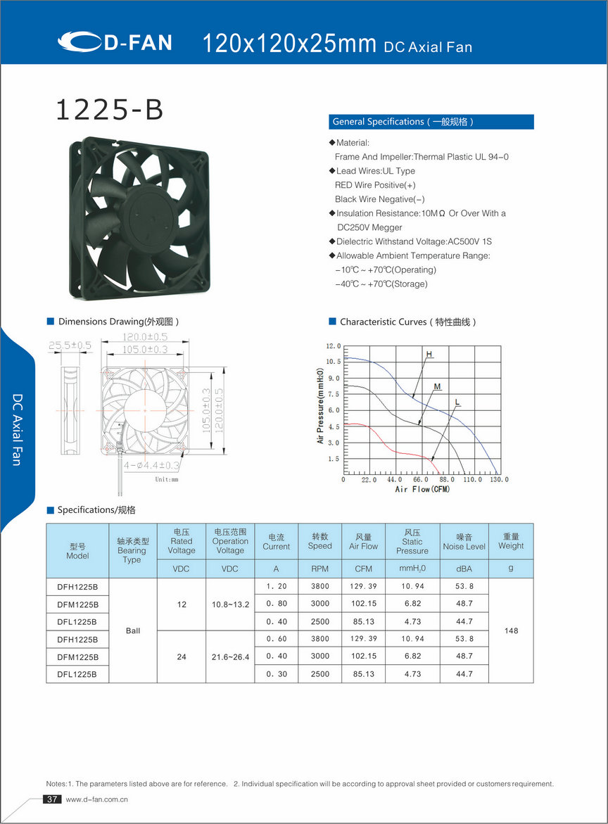 材料: 框架和叶轮:热塑UL 94-0 引线.UL类型 红色导线正极(+) 黑线负极(-) 绝缘电阻:10MΩ或以上,带DC250V高阻表 介电耐压:AC500V 1S 允许环境温度范围: -10℃-+70℃(运行) -40℃-+70℃(储存)